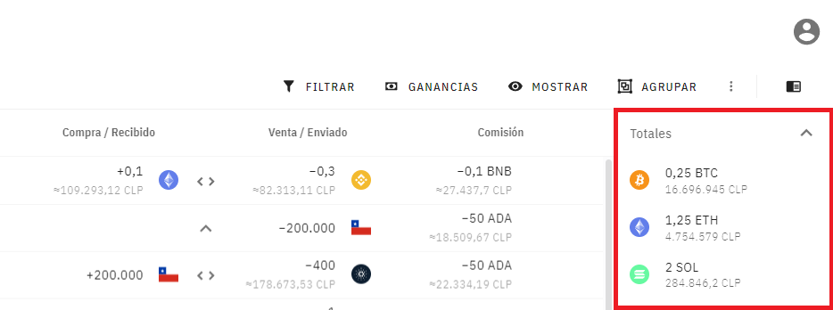 Para esto, el primer paso es que vayas a la sección “Transacciones” en el menú lateral izquierdo y luego revises los valores en “Totales”. Aquí encontrarás cuánto deberías tener de cada moneda en tus billeteras y exchanges.